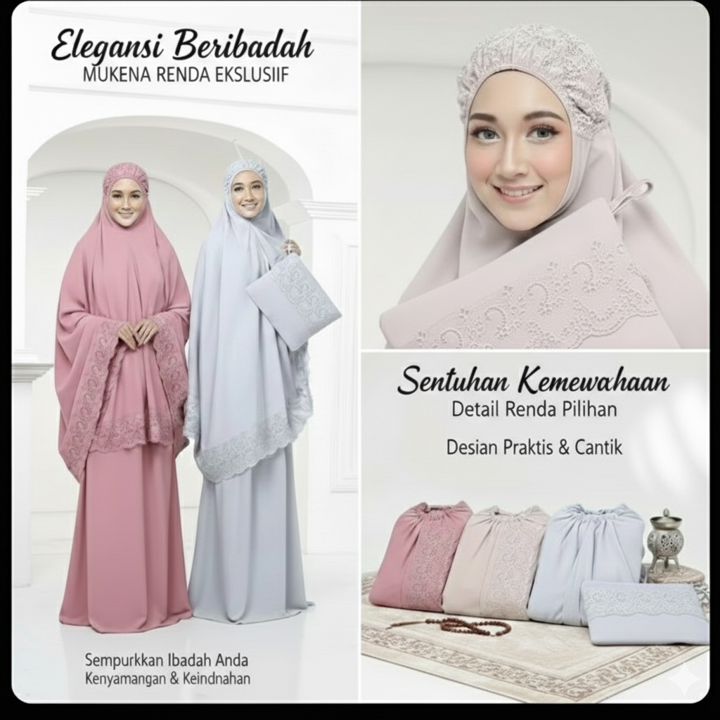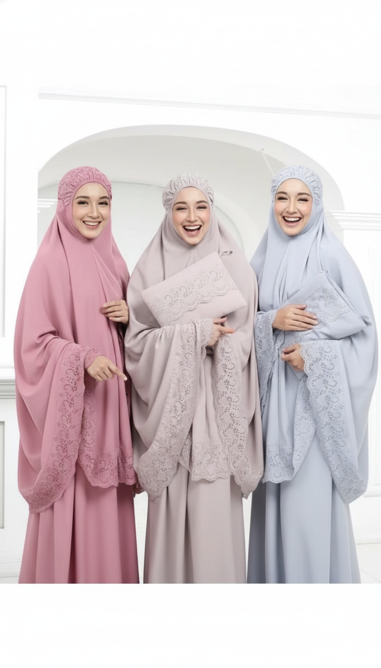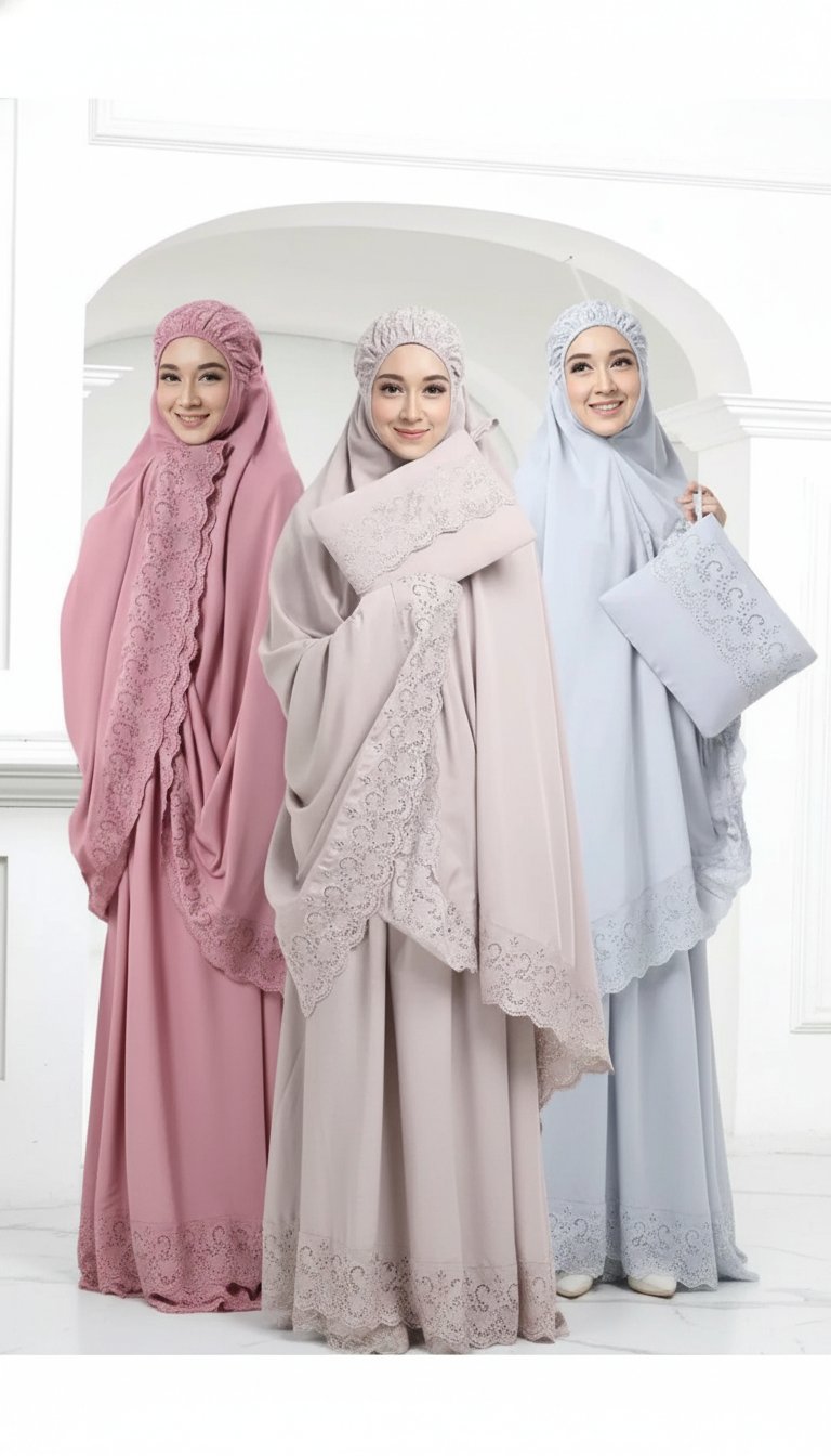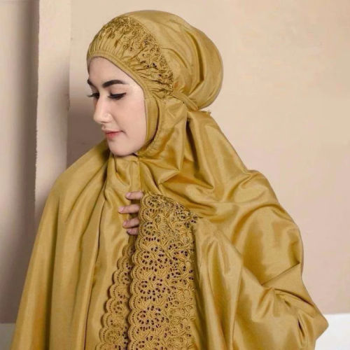 • Aksen renda eksklusif memberikan kesan mewah dan anggun di setiap gerakan salat.